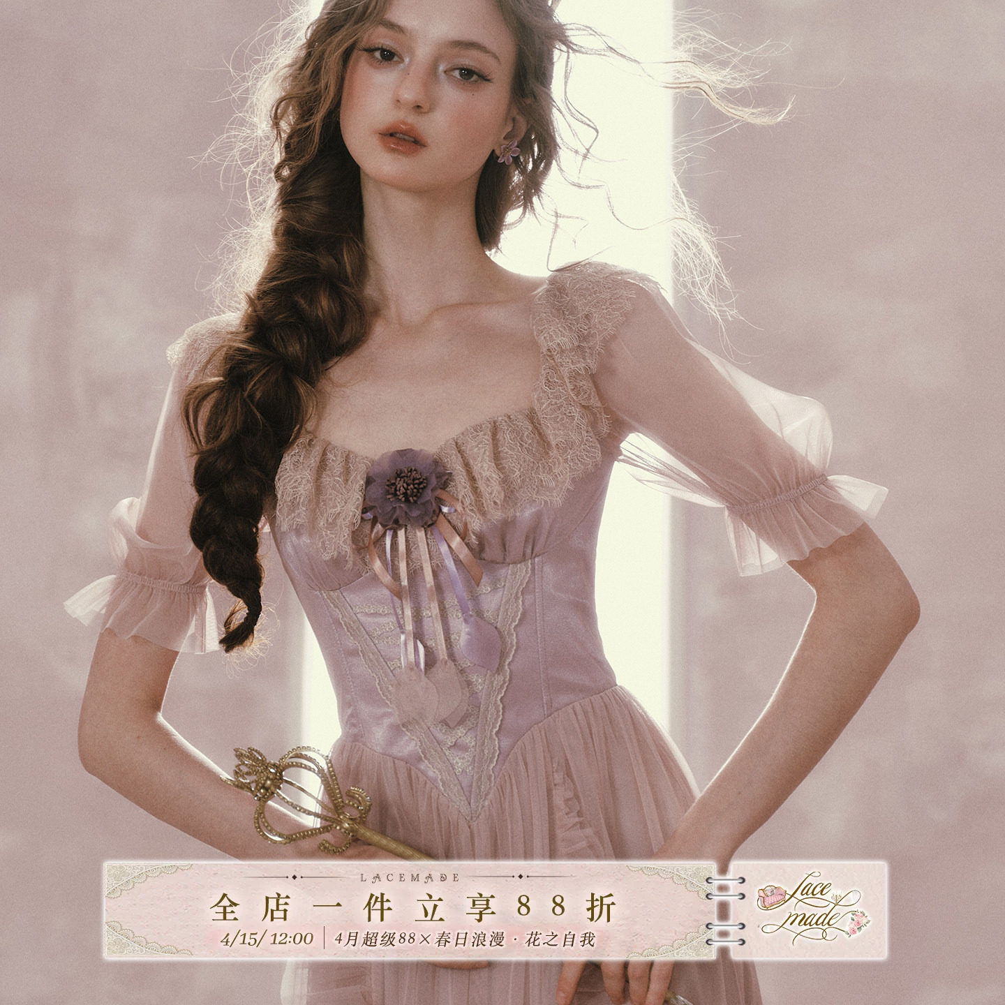 LaceMade 紫鸢公主 法式维多利亚风网纱裙紫色鱼骨连衣裙春夏长款