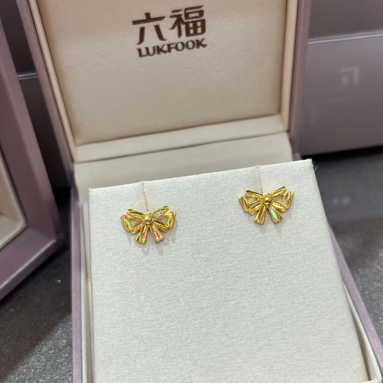 六福珠宝代购 冰钻·光影金足金礼结蝴蝶结黄金耳饰 新款专柜正品