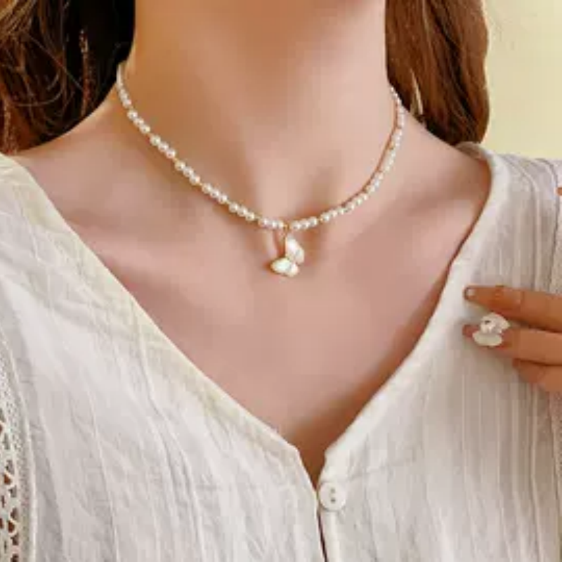 达令 贝母蝴蝶珍珠项链 长款毛衣链 时尚小众吊坠 女士高级感配饰