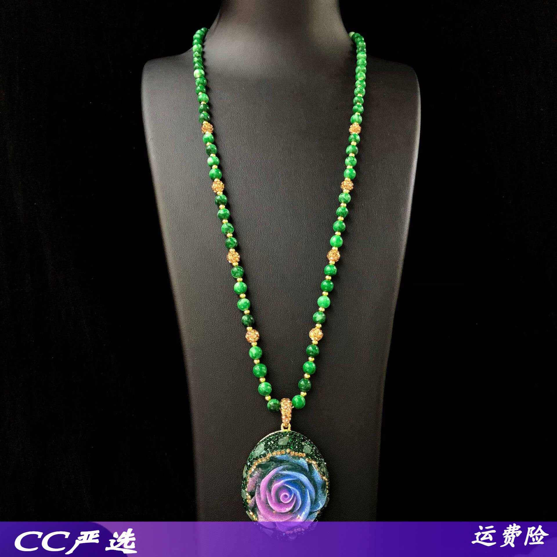 新款双色玫瑰花大吊坠项链绿玉髓圆珠链时尚高级感女士长款毛衣链
