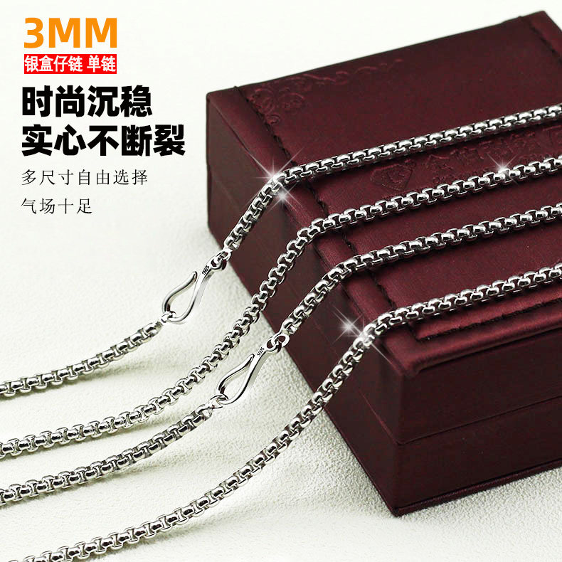 s925纯银盒仔链男女士项链帅气锁骨链时尚百搭吊坠链子长款毛衣链