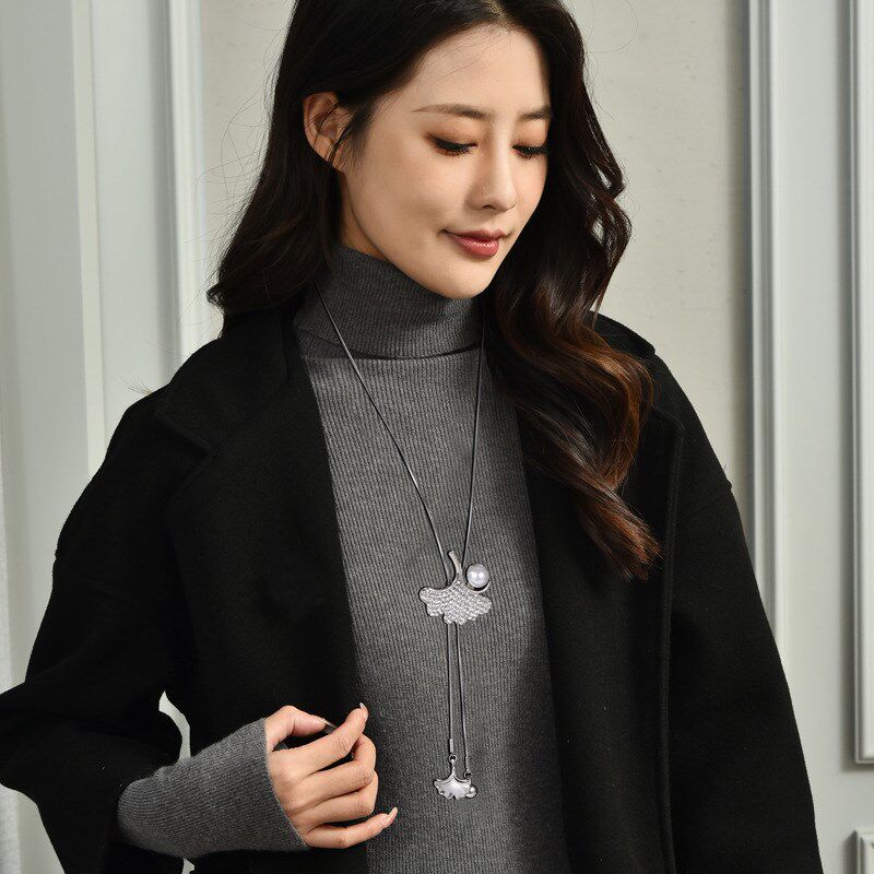 韩国时尚项链银杏叶子毛衣链长款珍珠吊坠秋冬女士衣服挂件配饰品