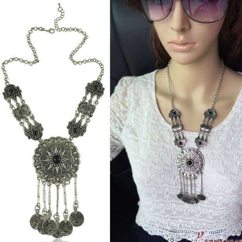 时尚波西米亚复古雕花长款圆形流苏钱币项链民族图锁骨链女士用品