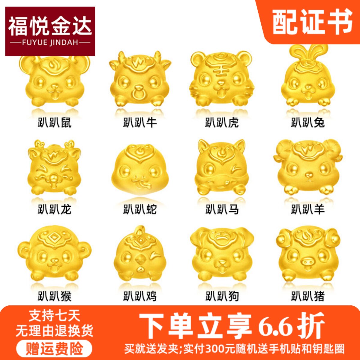 999足金十二生肖趴趴萌兽5D黄金本命年转运珠硬金蛇牛鸡手串手链