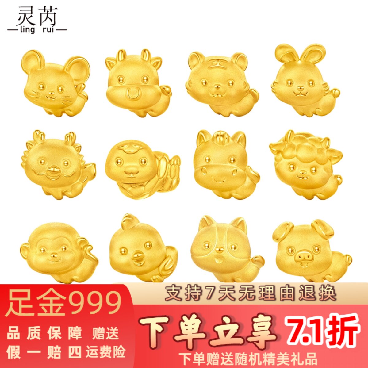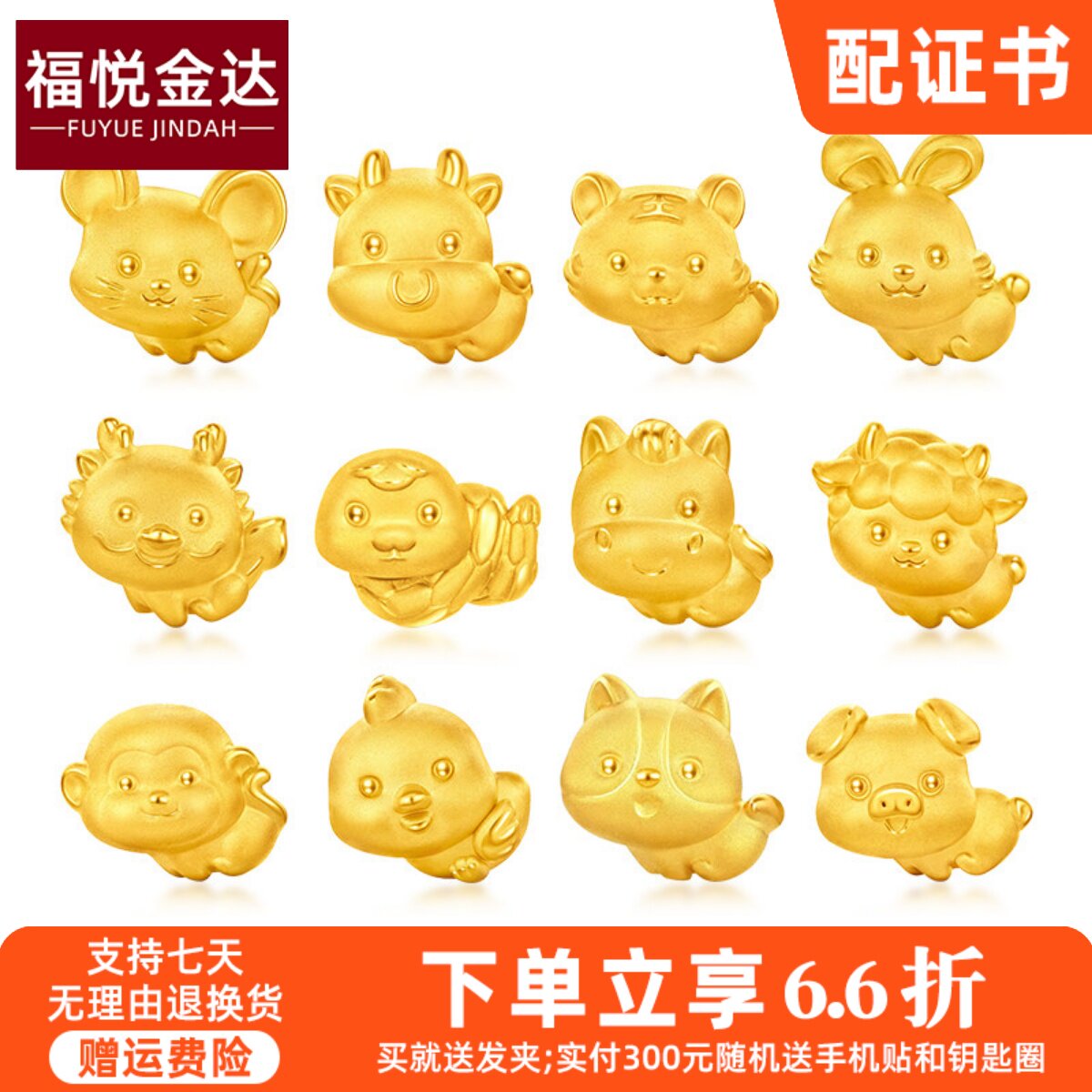 999黄金十二生肖马吊坠足金龙蛇鸡羊兔猴牛转运珠本命年金饰挂坠
