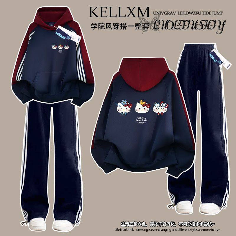 2026秋冬插肩三条杠连帽卫衣长裤套装女童卡通印花学院风可爱ins