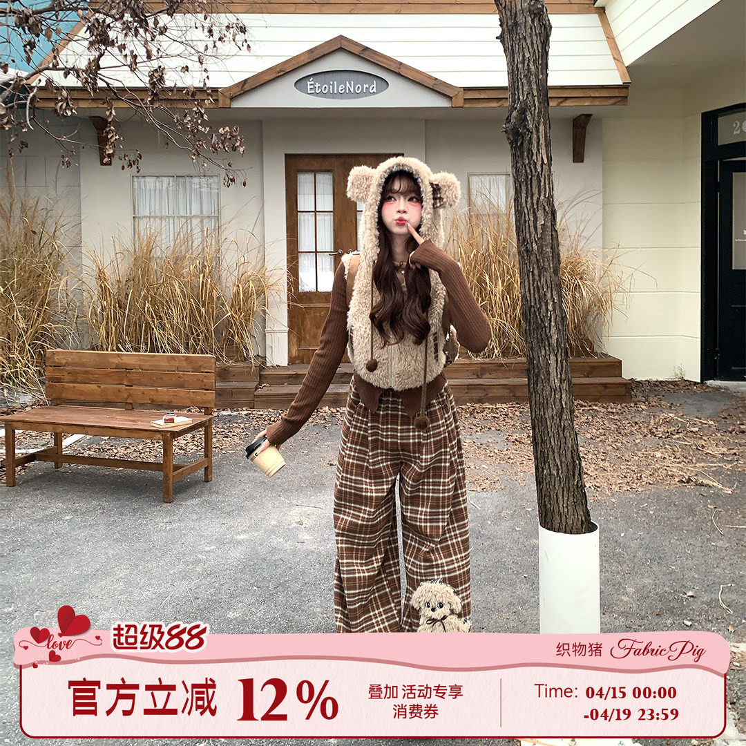 织物猪 栗子小熊 复古学院风假两件连帽卫衣女秋冬长袖短外套套装