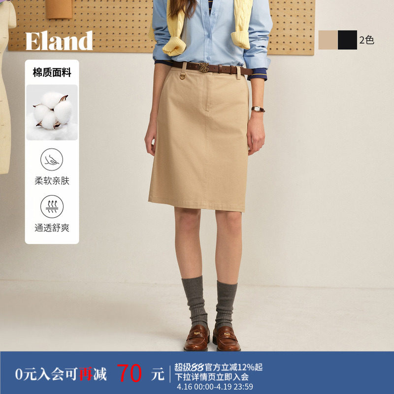 Eland衣恋半身裙女纯色棉质收腰H版型通勤裙子2026春季新款