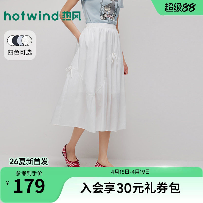 热风女士白色半身裙2026年夏季新款简约分割伞裙蝴蝶结宽松半裙