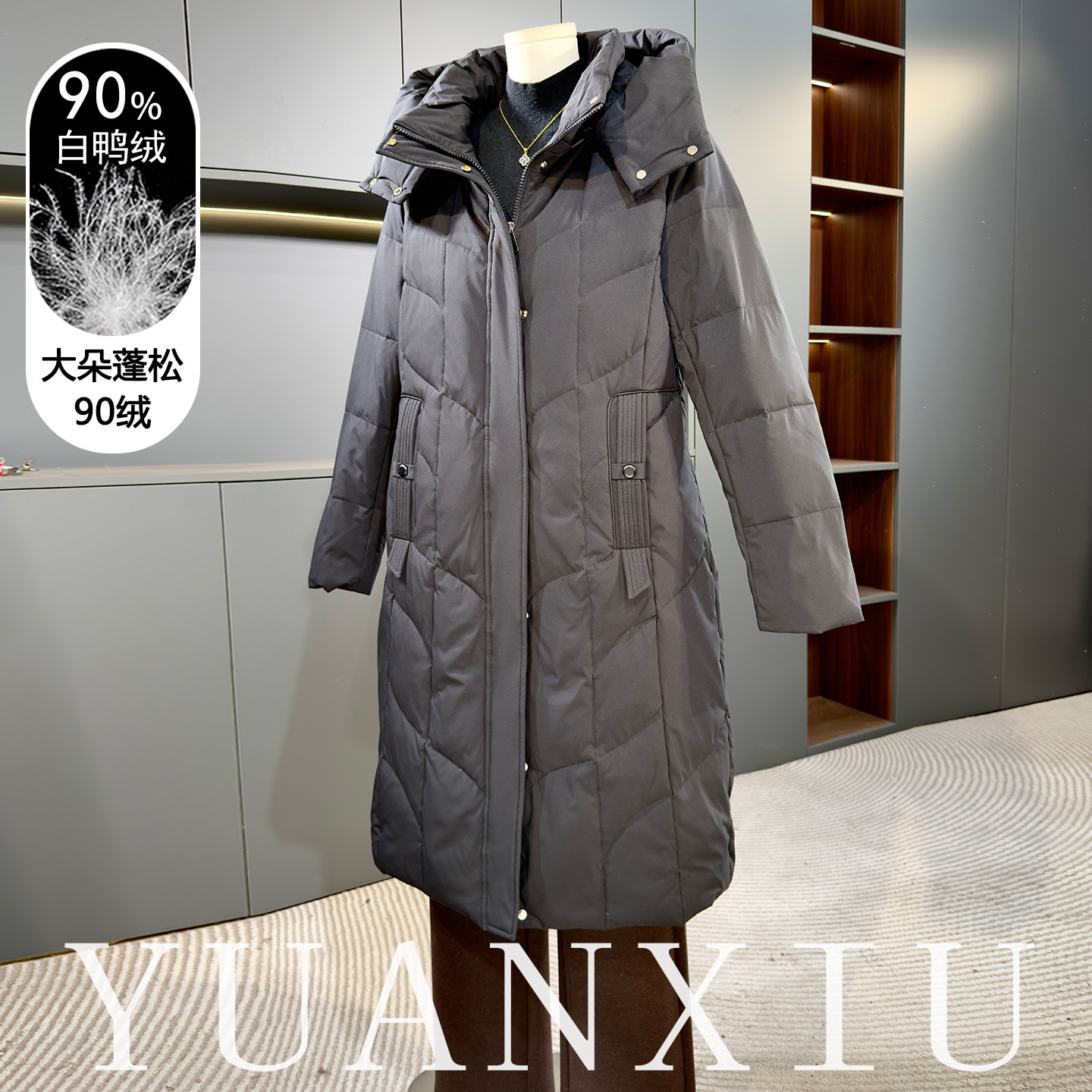 - 白鸭绒过膝羽绒服女