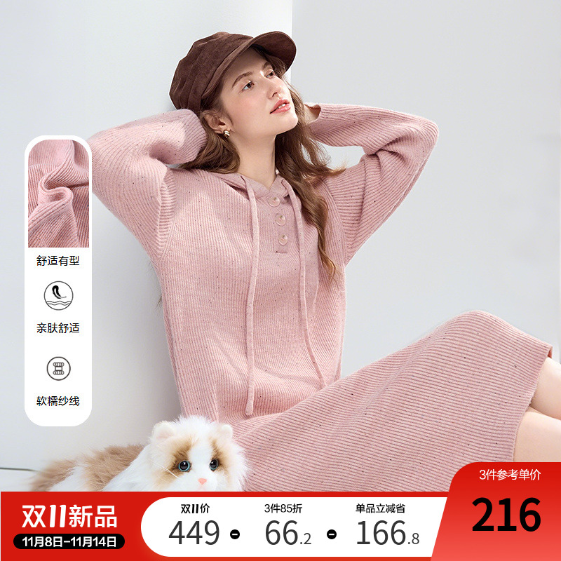 betu百图减龄连帽针织连衣裙女中长裙2025年冬季新款粉色毛衣裙