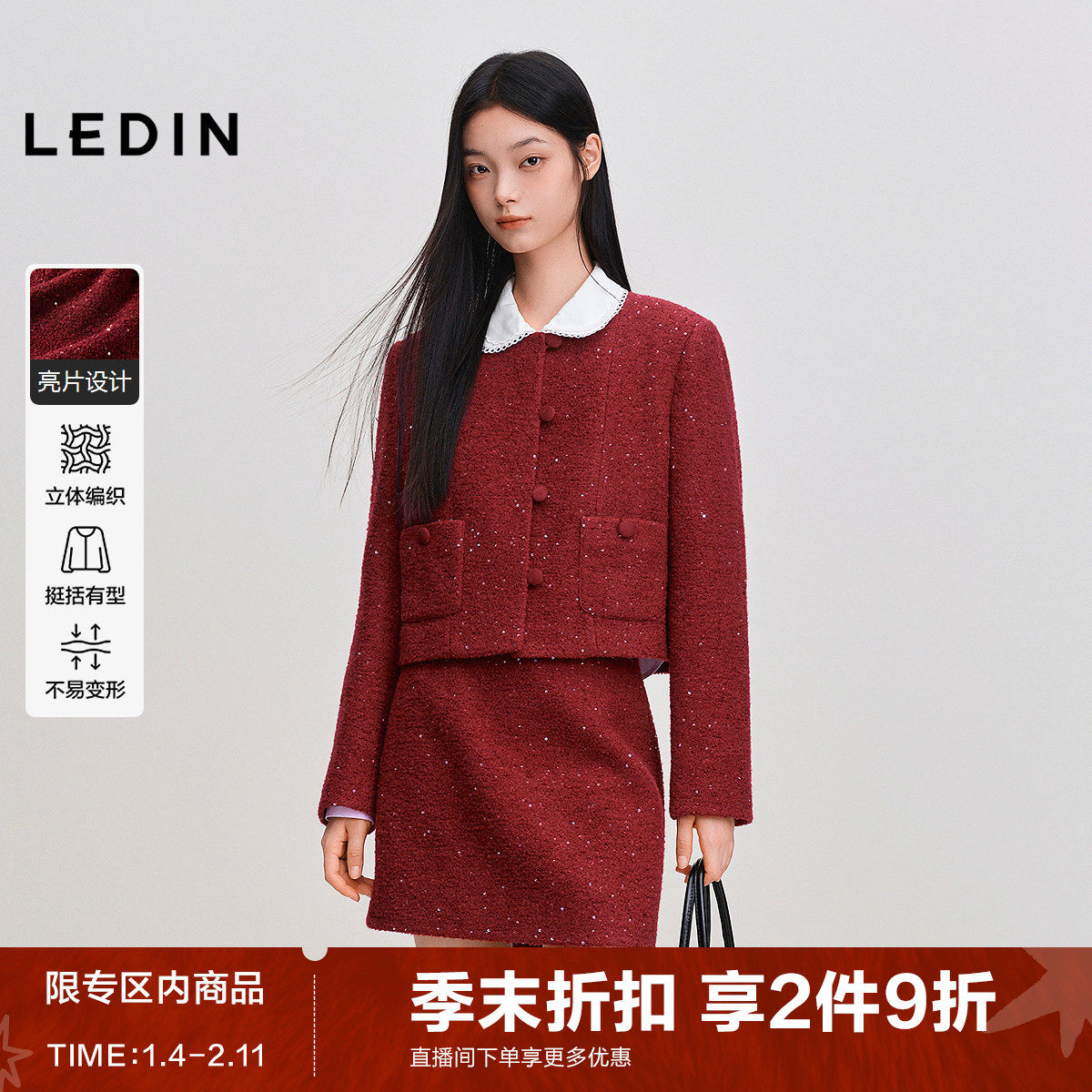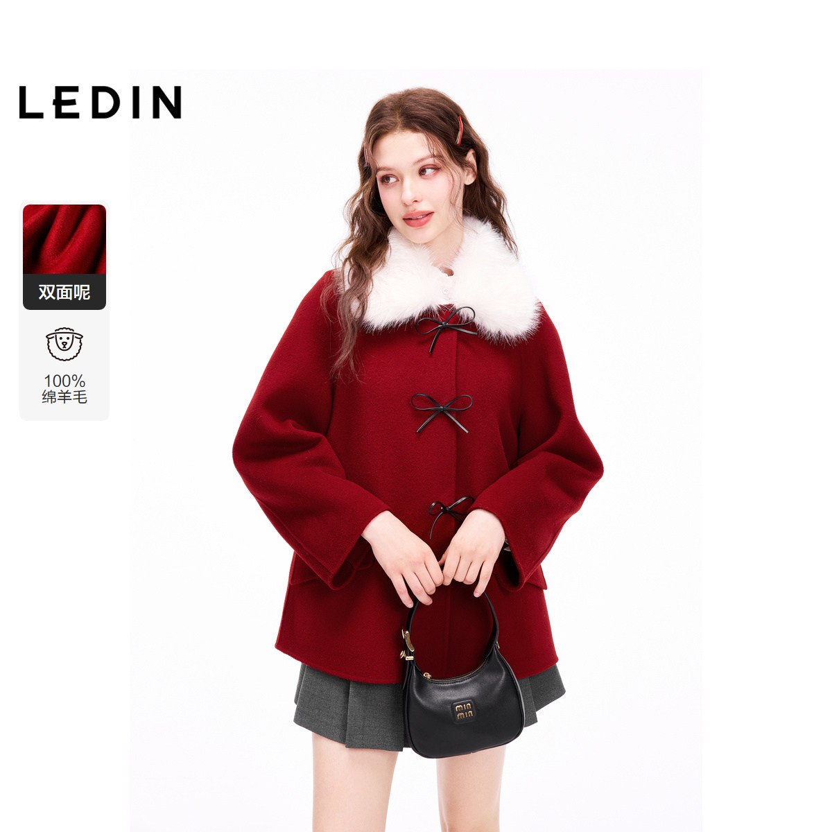 【商场同款】乐町秋冬季新款蝴蝶结装饰毛呢外套大衣红色毛领大衣