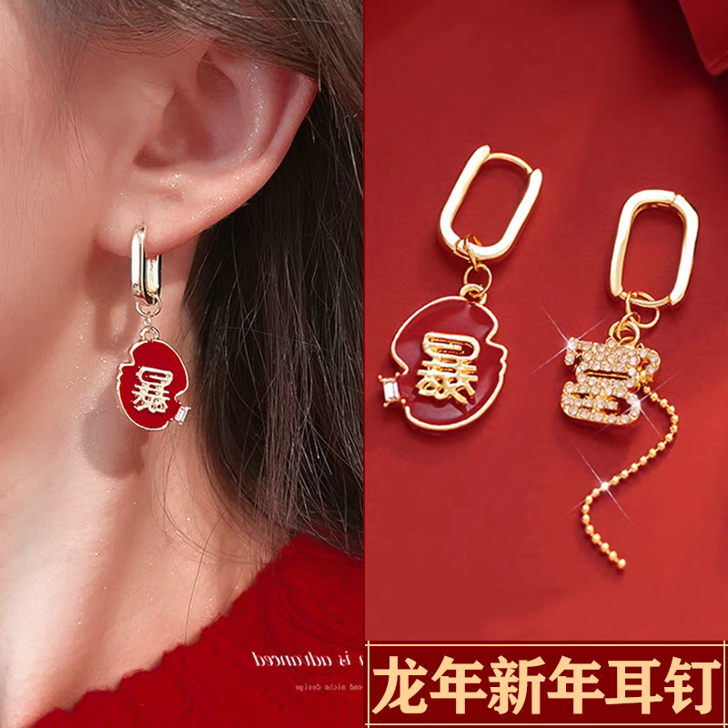 2026喜庆耳环女小众设计感招财纳福红色耳饰不对称耳坠灯笼耳钉