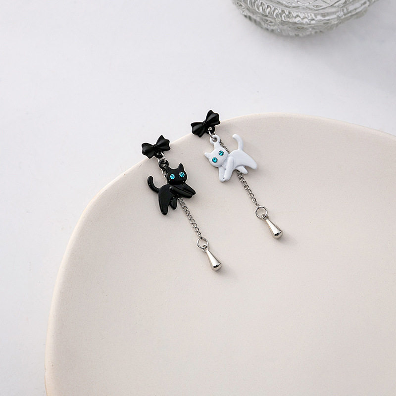 银针趣味卡通可爱猫咪耳环 甜美日韩不对称耳坠设计感蝴蝶结耳饰