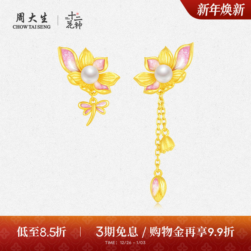 周大生足金莲花耳钉女珍珠喜事莲莲耳饰AB款不对称耳坠新年礼物