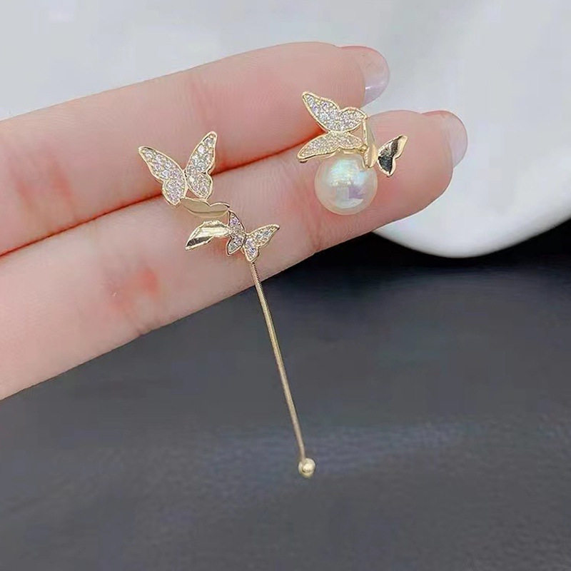 不对称蝴蝶流苏耳环女气质小众独特珍珠款耳钉耳坠新款高级感耳饰