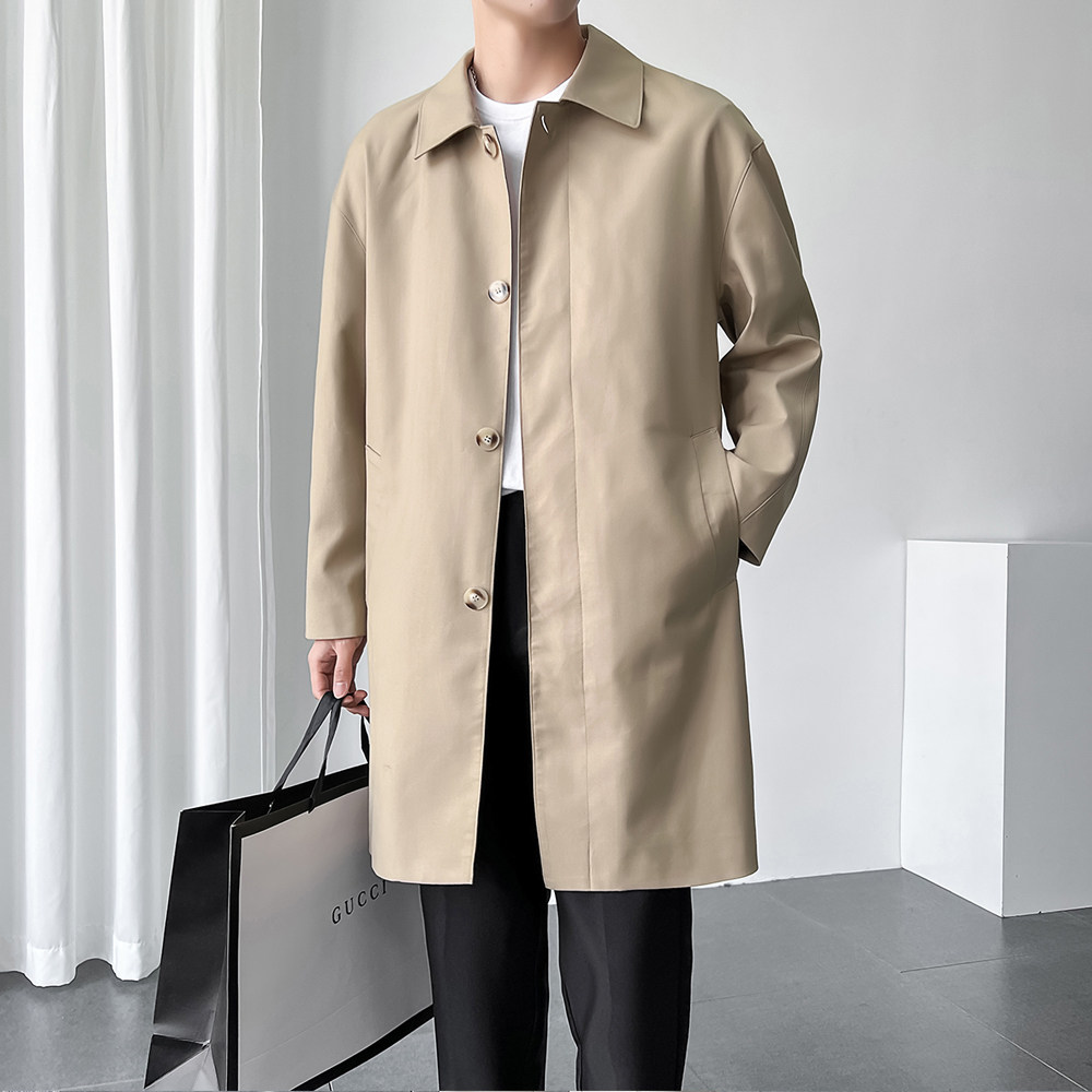 地界二男士韩版长款过膝大衣宽松潮流百搭外套春秋纯色单排扣风衣