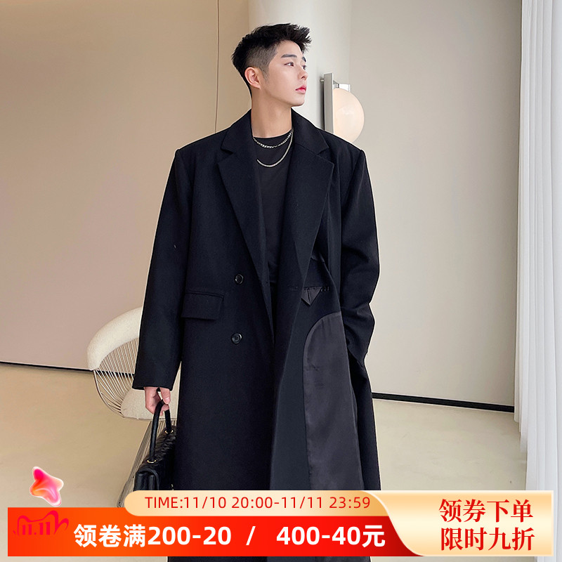 秋冬季设计感缎面拼接解构侧开叉双层毛呢大衣男韩版过膝风衣外套