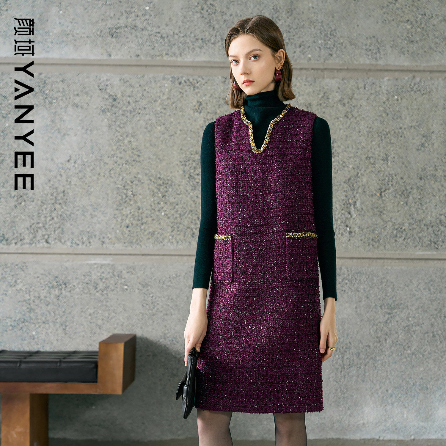 颜域紫色小香风连衣裙女士2025新款冬季复古优雅背心裙中长款裙子