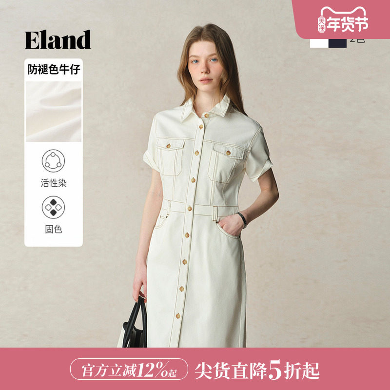 【100%棉】Eland衣恋连衣裙女甜美H型微落肩中长款裙子25夏季新款
