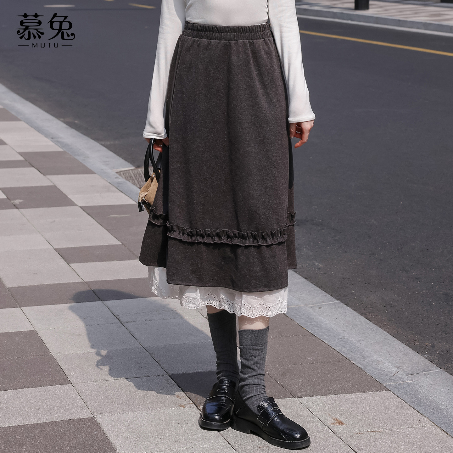 慕兔法式木耳边假两件半身裙女2025冬季新款小个子高腰中长款裙子