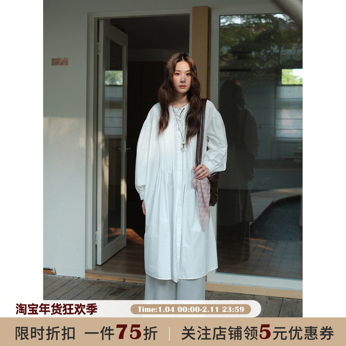 JOCO CHIC 米白色法式褶皱长袖连衣裙女秋季宽松灯笼袖中长款裙子