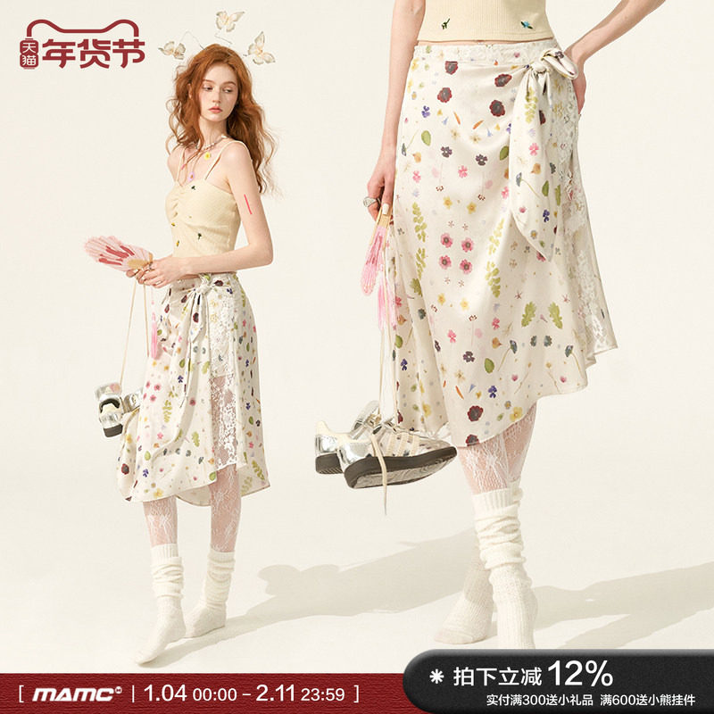 MAMC碎花绑带白色半身裙女2024夏季新款不规则甜美高级中长款裙子