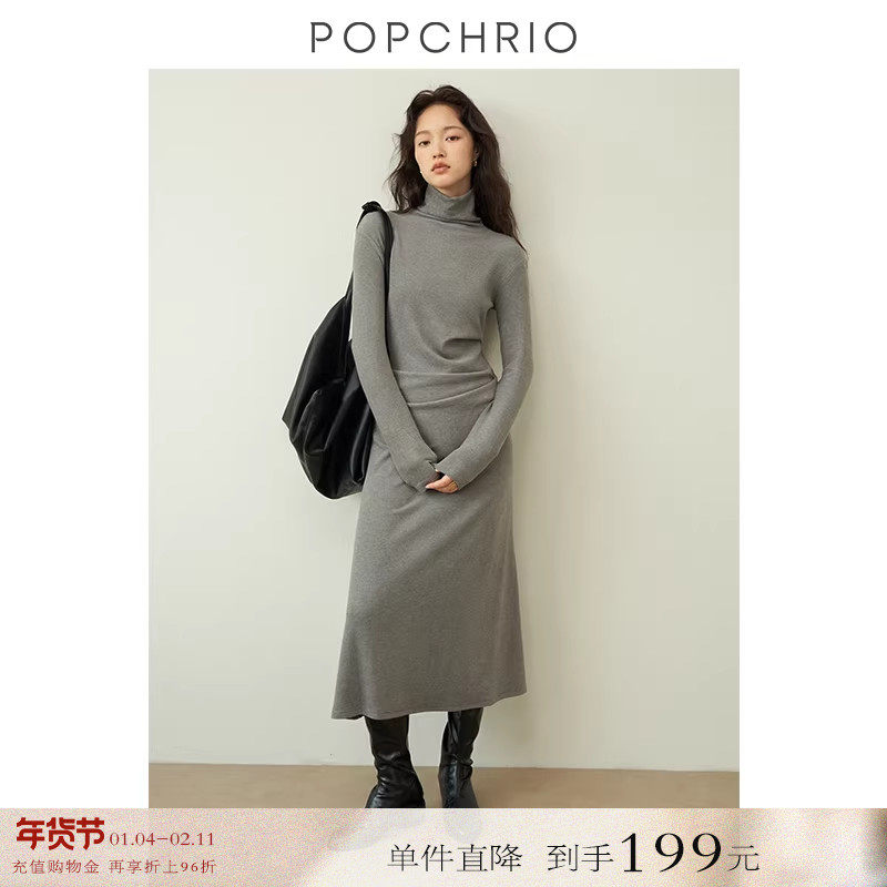 【到手199元】叠褶修身显瘦堆堆高领针织长袖连衣裙中长款裙子女