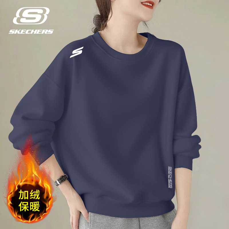 斯凯奇灰色卫衣女圆领宽松加绒保暖2025冬季新款美式学生百搭外套