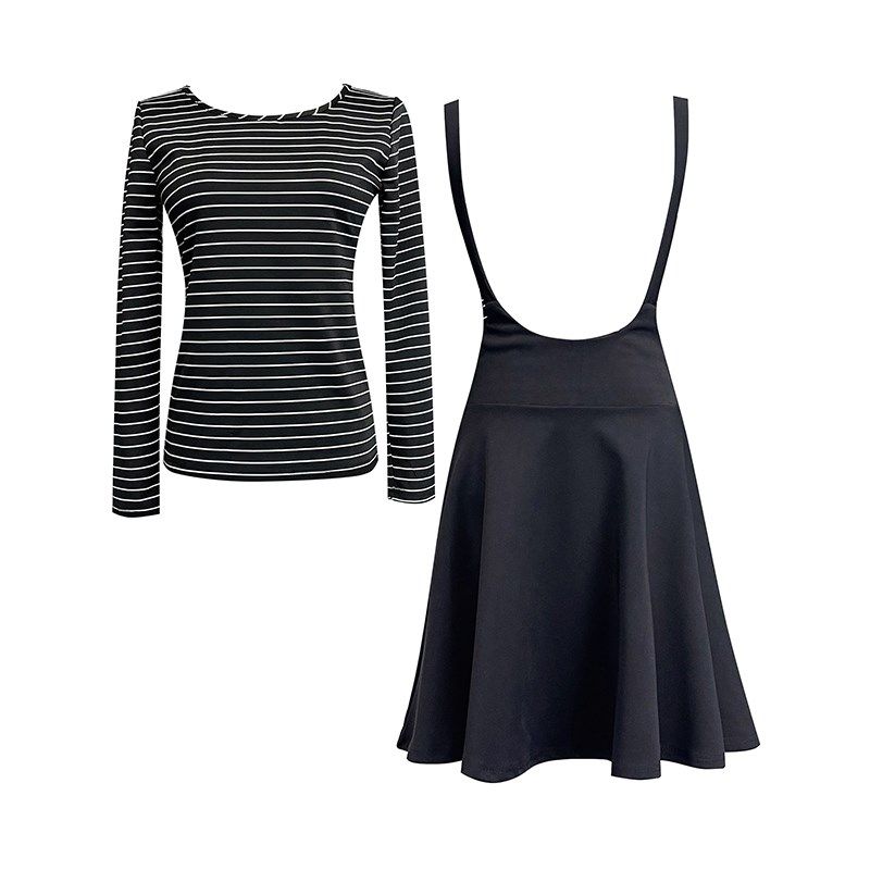 两件套条纹T恤连衣裙女2022春秋弹力修身可爱百搭背带裙a字仙女裙