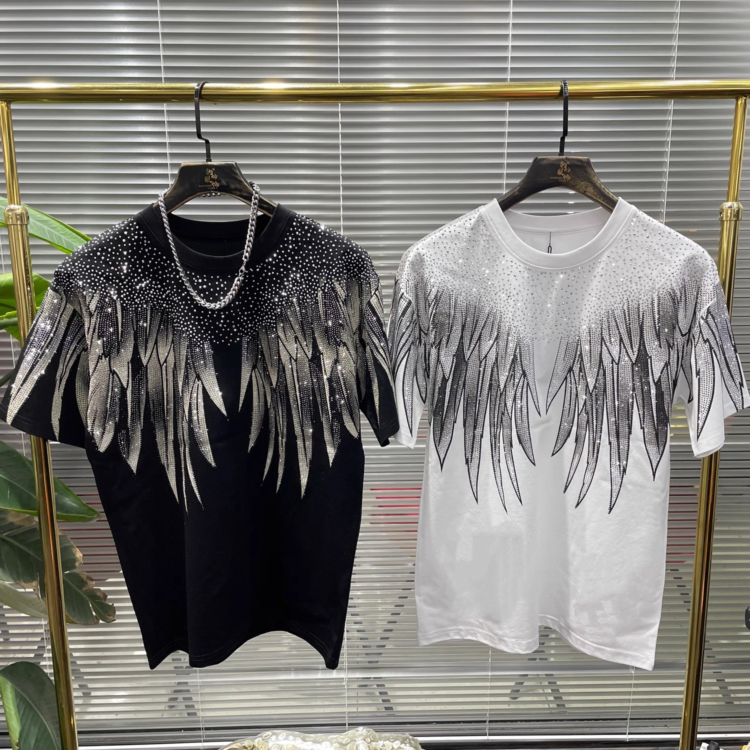 简欧小众别致高品质十字潮个性烫钻翅膀图案圆领大码300斤男女T恤