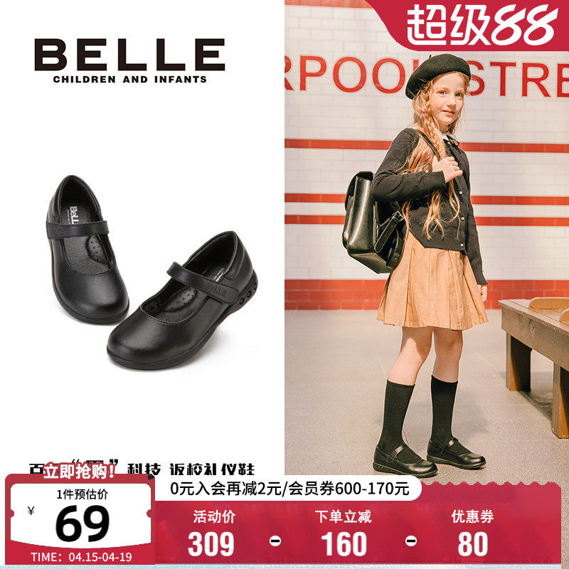 百丽童鞋儿童时尚百搭黑皮鞋秋季女童真皮学生鞋中大童英伦风单鞋