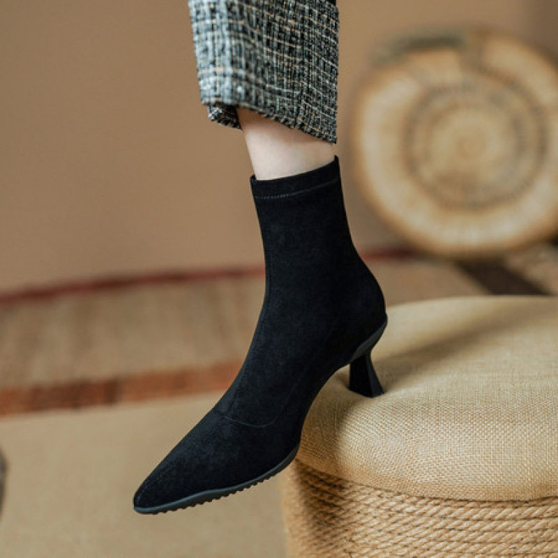 2025秋冬新款真皮尖头细跟短靴女绒面弹力瘦瘦靴软底百搭高跟袜靴
