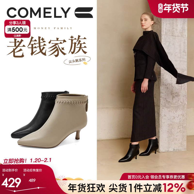 康莉真皮细跟时装靴2025冬季新款时尚尖头气质百搭通勤短靴及踝靴