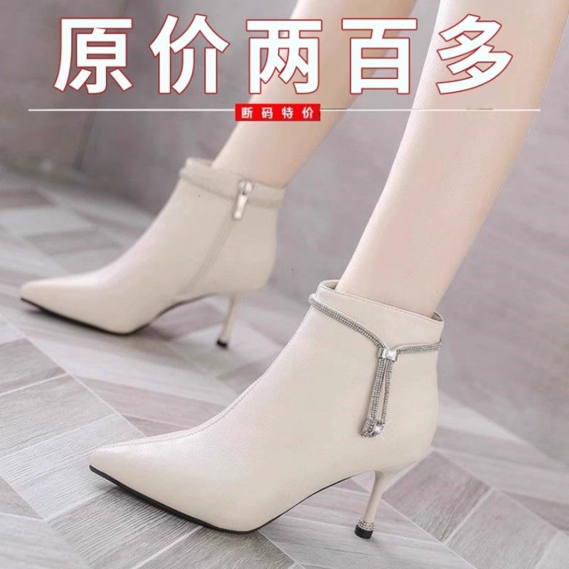 品牌撤柜真皮尖头细跟短靴女米白色秋冬水钻百搭单靴加绒高跟皮鞋