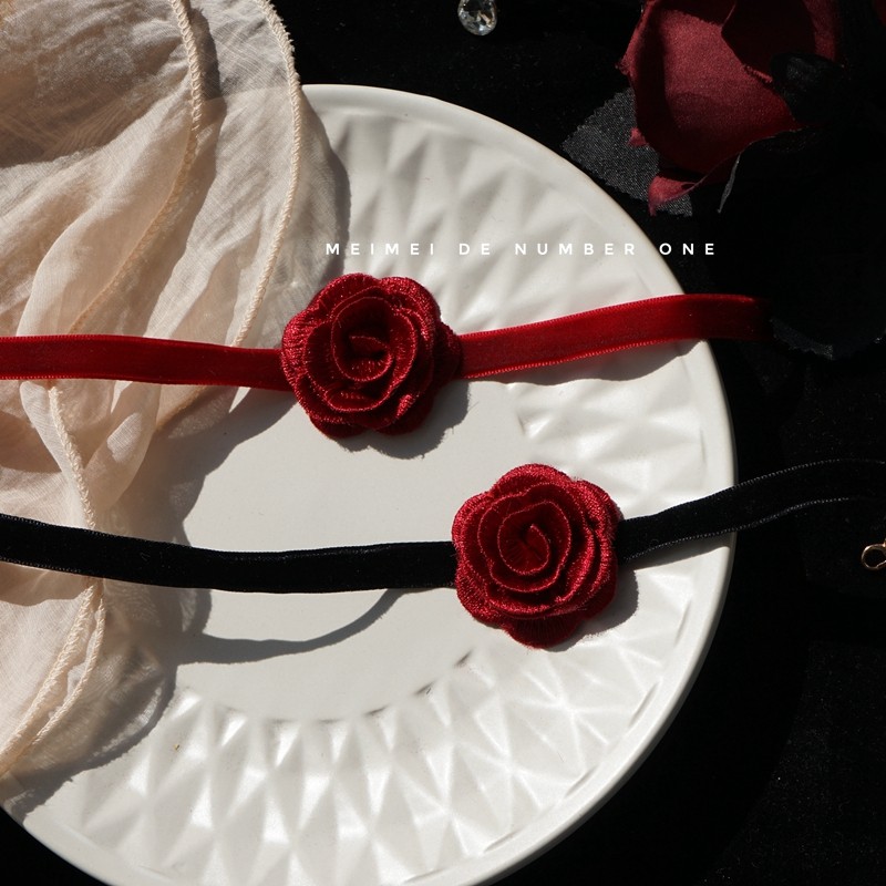原创设计秋冬新款新年酒红色花朵丝绒choker复古性感气质颈带项圈