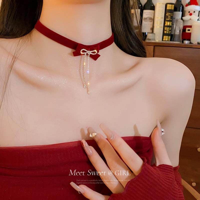 圣诞红色项链丝绒蝴蝶结颈链choker颈带轻奢小众锁骨链脖子配饰女