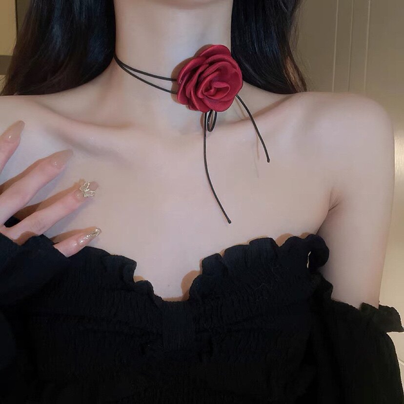 颈带海边红色玫瑰花项链项圈简约丝绒蕾丝锁骨复古花朵choker颈链