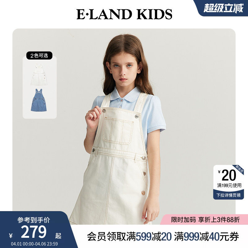 eland kids衣恋童装女童背带裙夏季学院风刺绣复古休闲牛仔裙洋气