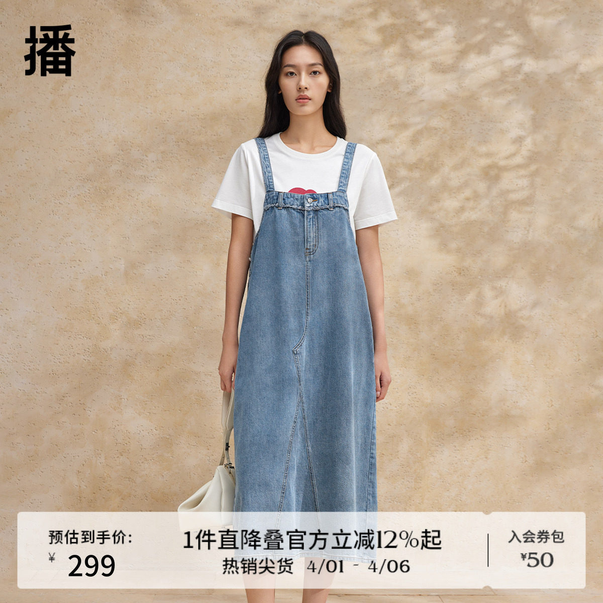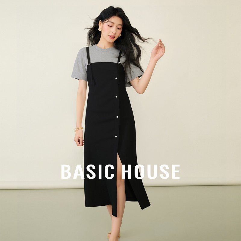 Basic House/百家好假两件背带连衣裙撞色小众设计感中长款裙2026
