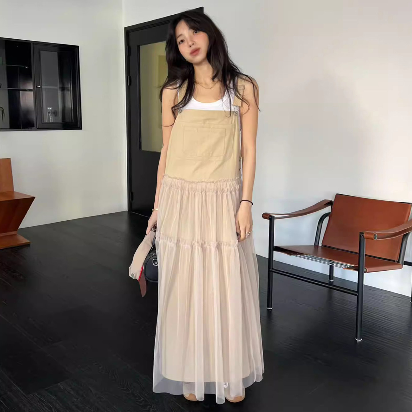 良良家 复古小众网纱拼接假两件连衣裙女春季新款纯色长款背带裙