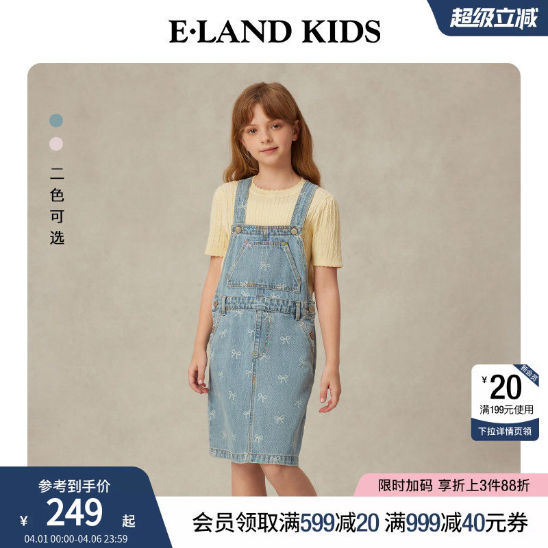 eland kids衣恋童装女童背带裙夏季复古学院风清新蝴蝶结牛仔裙