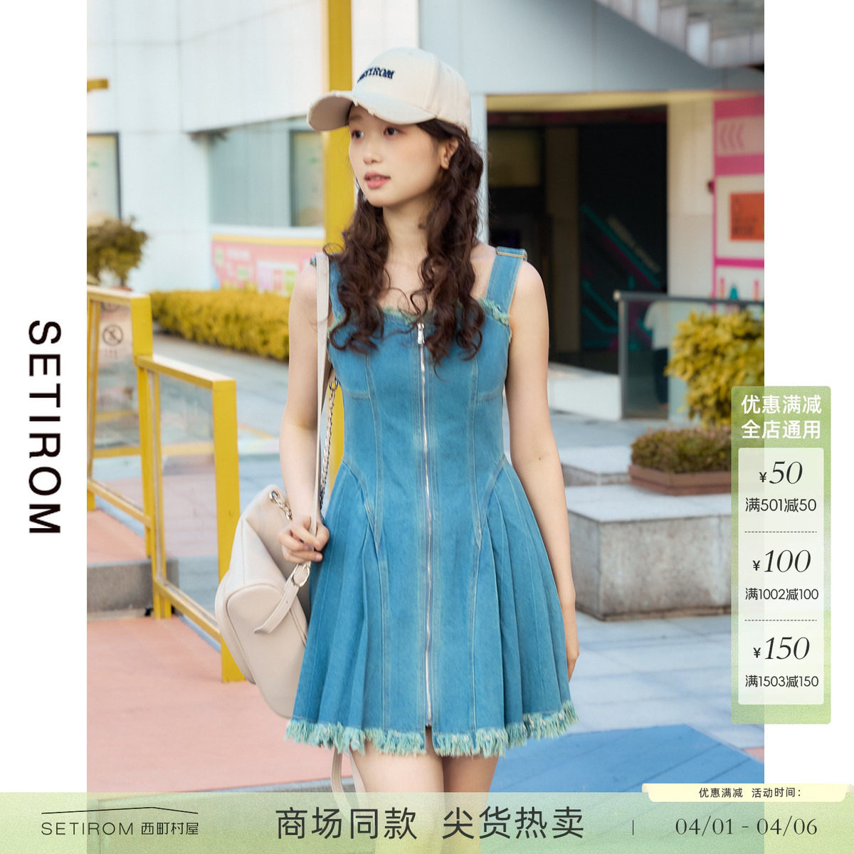 西町村屋复古牛仔吊带裙女夏季新款法式短款毛边背带裙AB9404006