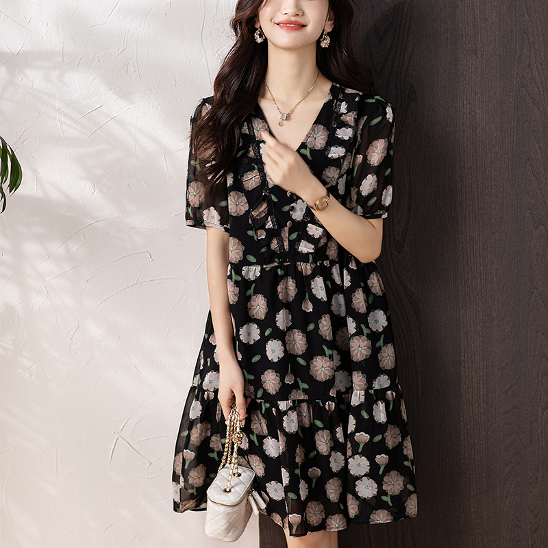 2025夏季新款韩版时尚百搭显瘦V领雪纺短袖连衣裙女潮印花中长裙