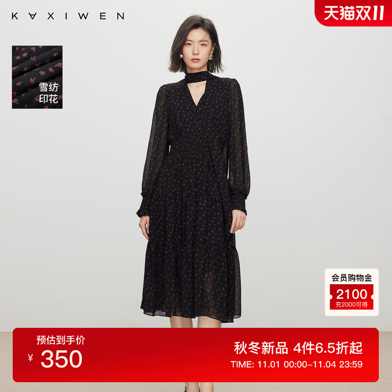 2024春秋季新款气质显瘦中长款碎花裙女立领收腰长袖雪纺连衣裙潮
