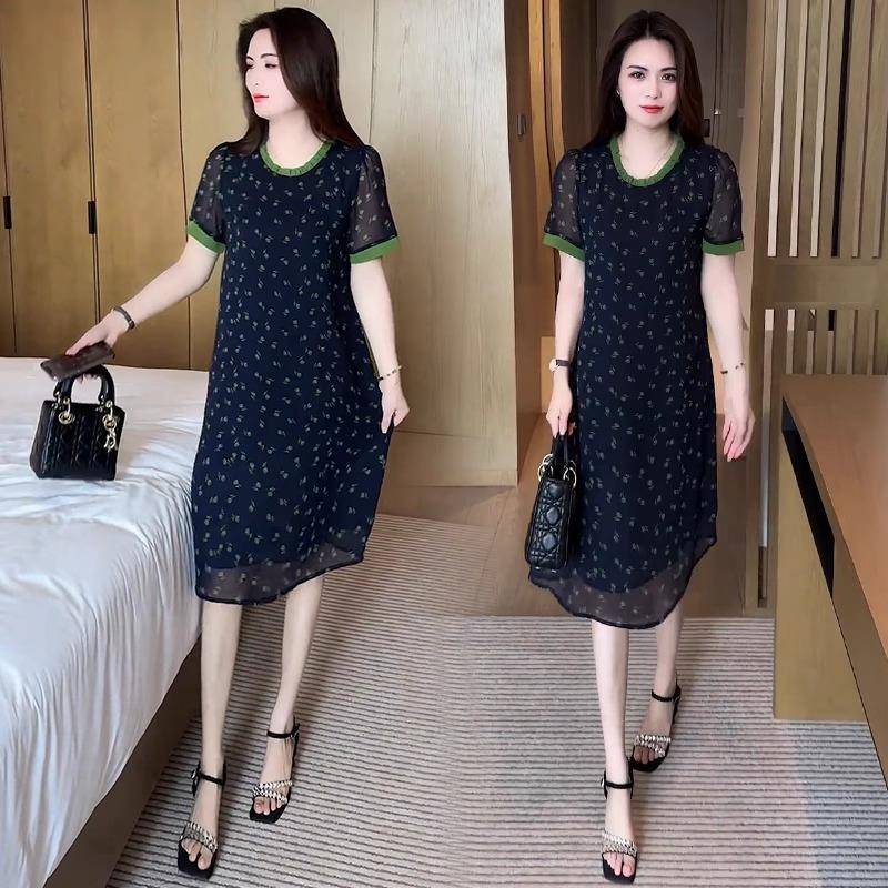 大码女装夏季拼接碎花雪纺中长连衣裙女2025年新款短袖显瘦裙子潮