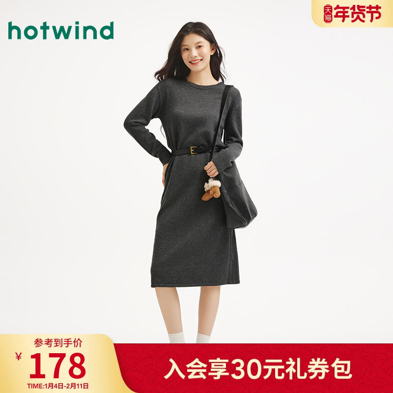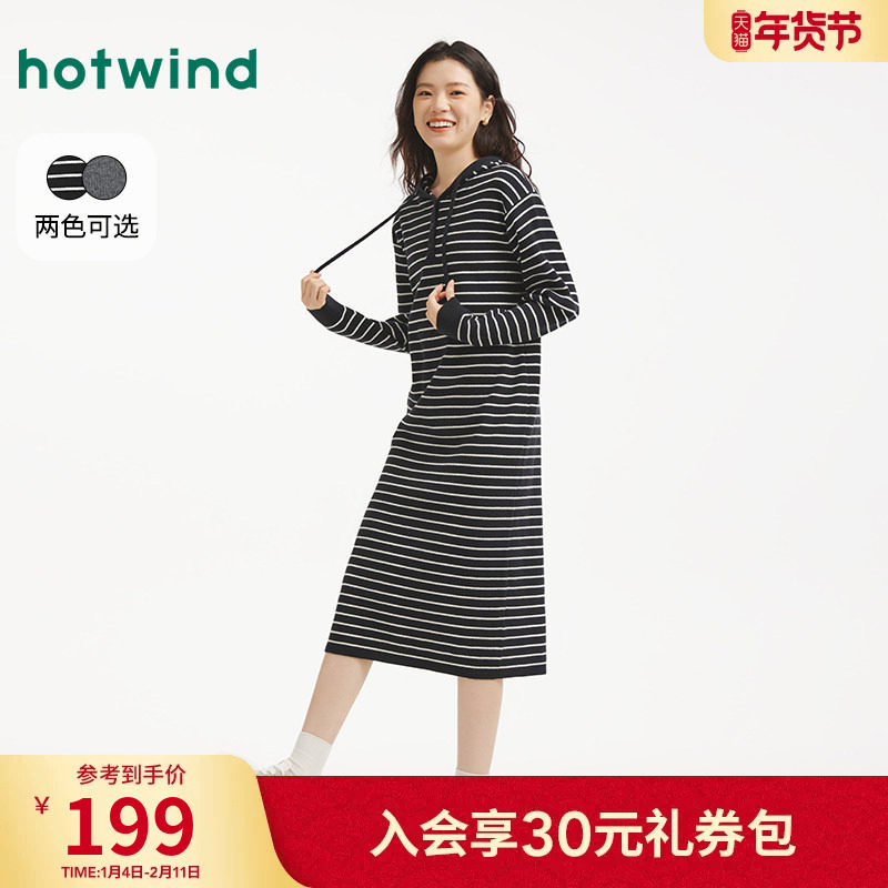热风女士连衣裙打底衫2025年冬季新款连帽针织连衣裙宽松直筒长裙