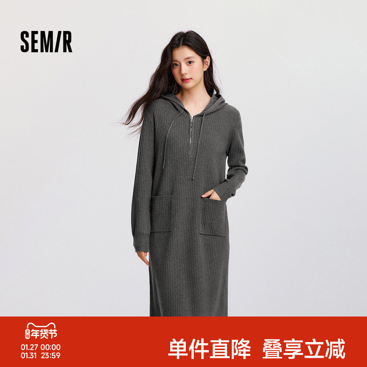 森马连衣裙女显瘦肌理纯色打底针织裙时尚温柔冬季连帽中长裙优雅