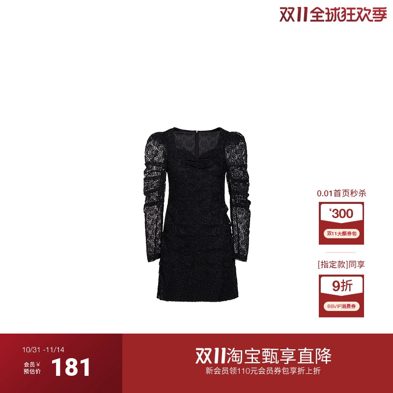 绣花蕾丝羊腿袖连衣裙 ochirly欧时力2024新款春装显瘦短款小黑裙