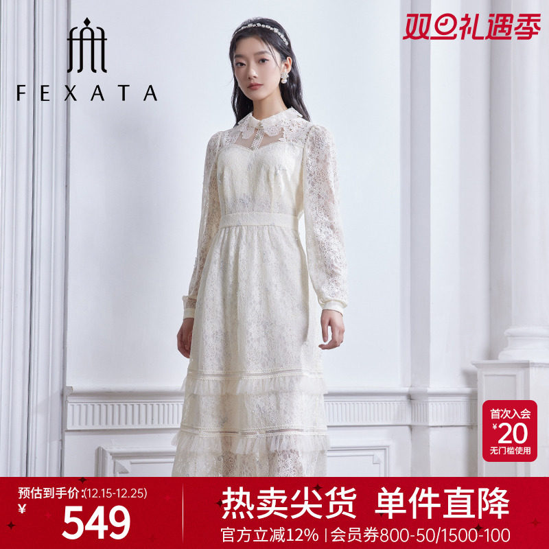 FEXATA斐格思2025秋季新品长袖收腰浪漫千金感长款蕾丝裙连衣裙